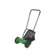 Cette tondeuse à gazon RAZERB à main et mécanique possède des lames hélicoîdales et un bac de ramassage.