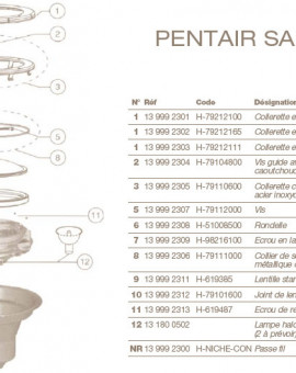 Passe fil, écrou, joint de lentille, lentille standard, collier de serrage, rondelle, vis, collerette et lampe halogène retrouvez tous les éléments qui composent votre projecteur Pentair et profitez en pour assurer son bon fonctionnement.